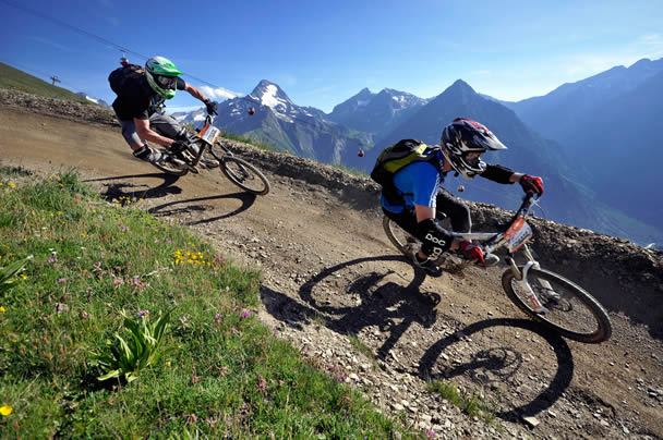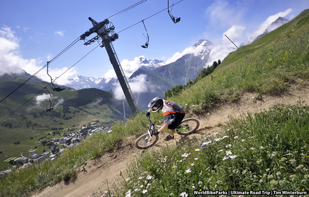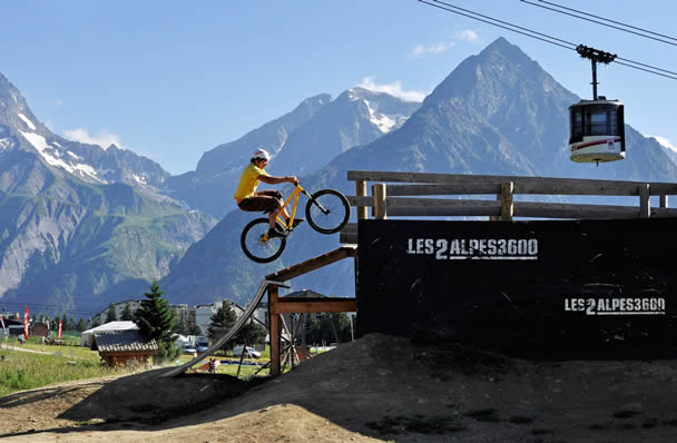 It’s should be pretty clear to you that Les 2 Alpes is a serious mountain bike destination. There are very few bike parks that can offer the amount and variation of what’s on offer here, both on and off the bike. They are not standing still either, with regular trail development. And 2013 will see a new 6-seater detachable chairlift installed where the Diable lift stands, making for faster more comfortable laps. The scenery is nuts - big mountains in every direction. A good tip - don’t ignore the Cretes trail from the top of Diables. This takes you down the ridge and after a short wooded section you emerge at the end of the ridge-line almost hanging off the Les 2 Alpes valley with cliffs plunging 100′s of meters down even further! It might be a gentle green but it’s green that you just have to ride.